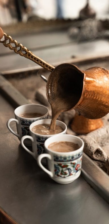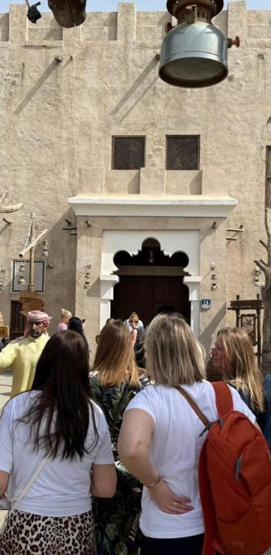Tussen de bezoeken door genieten we van Arabische koffie met een lokaal gebakje, midden in de levendige sfeer van oud Dubai.